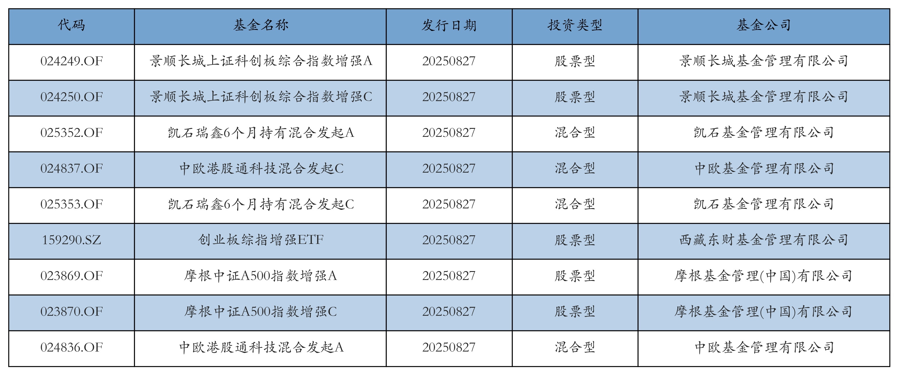 昨日有9只新基金发行,分别为:景顺长城上证科创板综合指数增强A、景顺长城上证科创板综合指数增强C、凯石瑞鑫6个月持有混合发起A、中欧港股通科技混合发起C、凯石瑞鑫6个月持有混合发起C、创业板综指增强ETF、摩根中证A500指数增强A、摩根中证A500指数增强C、中欧港股通科技混合发起A,详情见下表:
