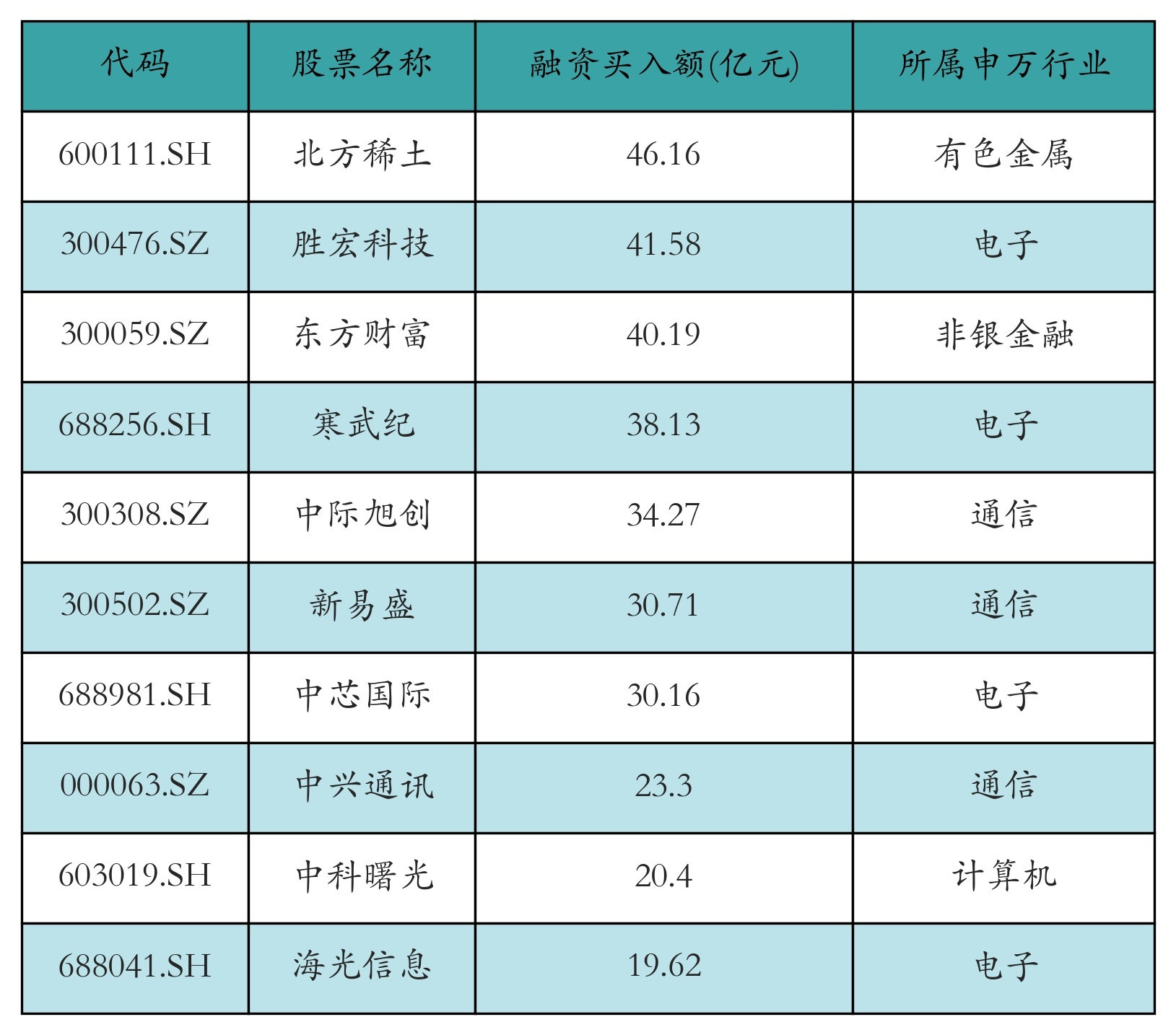 两市共有3444只个股有融资资金买入,其中北方稀土、胜宏科技、东方财富排名前三,买入金额分别46.16亿元、41.58亿元、40.19亿元。融资买入额前10个股详情见下表: