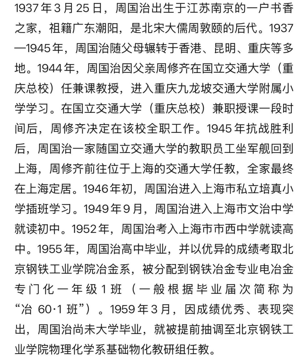 讣告显示:周国治先生,生于1937年3月,广东潮阳人,1960年7月毕业于北京钢铁学院(现北京科技大学),并提前留校在理化系任教,1978年破格晋升为副教授,1979年赴美国麻省理工学院进修,1982年学成回国,1984年破格晋升为教授、博士生导师,并获首批“国家有突出贡献中青年专家”称号,1995年当选为中国科学院院士,享受国务院政府津贴,2003年担任第十届全国政协委员。曾在美国麻省理工学院、波士顿大学等多所海外大学任客座教授,现为北京科技大学教授,上海大学、上海交通大学、安徽工业大学、重庆大学、武汉科技大学等多所大学兼职教授,同时兼任中国金属学会理事、国际矿业冶金杂志编委。