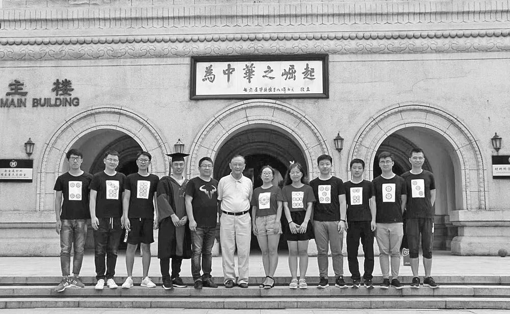 2015年左右,周国治(左六)、胡晓军(左五)与研究生在北京科技大学主楼前合影
